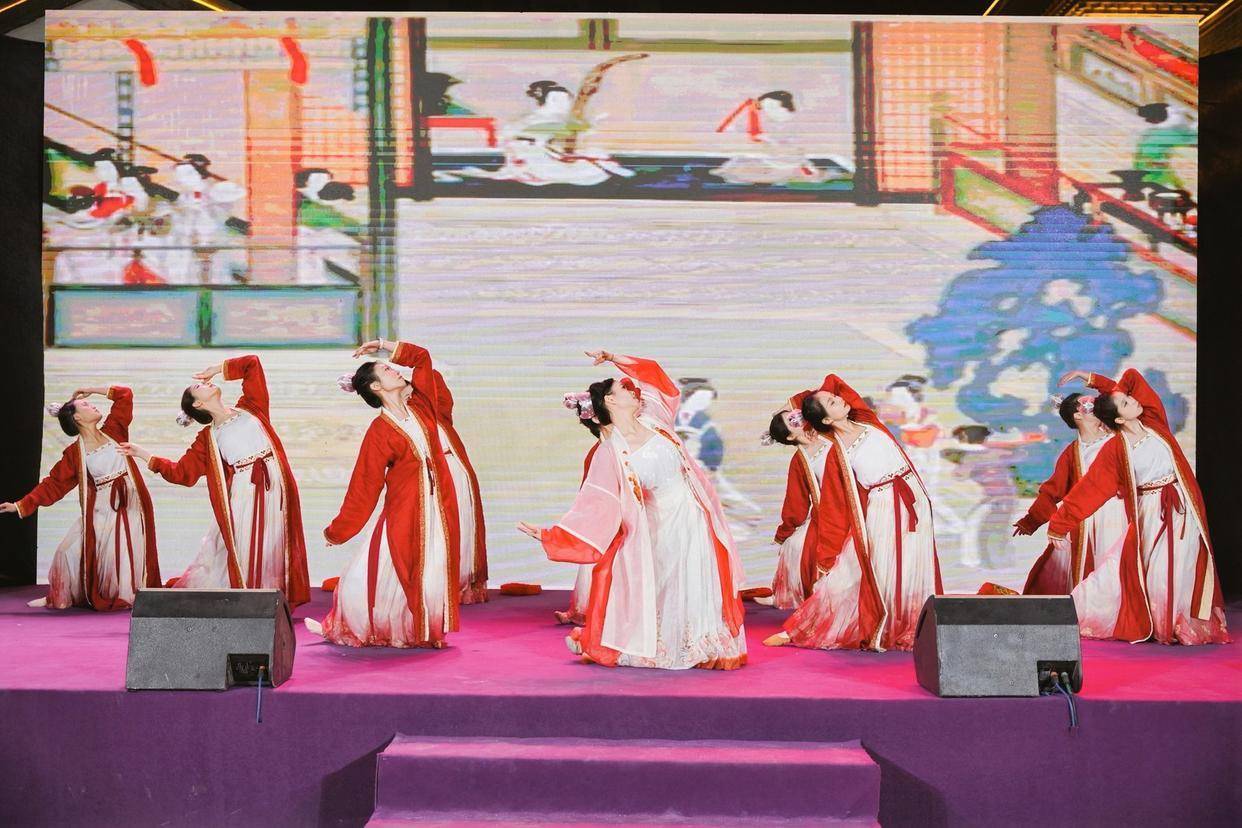 在“焕彩新乔·文化街区”启动仪式上,一场传统与现代激情碰撞的视觉盛宴惊艳开场。16位非遗大师一起亮相,共同拉开这场文化狂欢的序幕。紧接着,古风汉服表演《四雅迎宾》惊艳亮相。一群身着华丽汉服的演员,在悠扬婉转的古典音乐中翩翩起舞,身姿轻盈曼妙,让人如痴如醉。