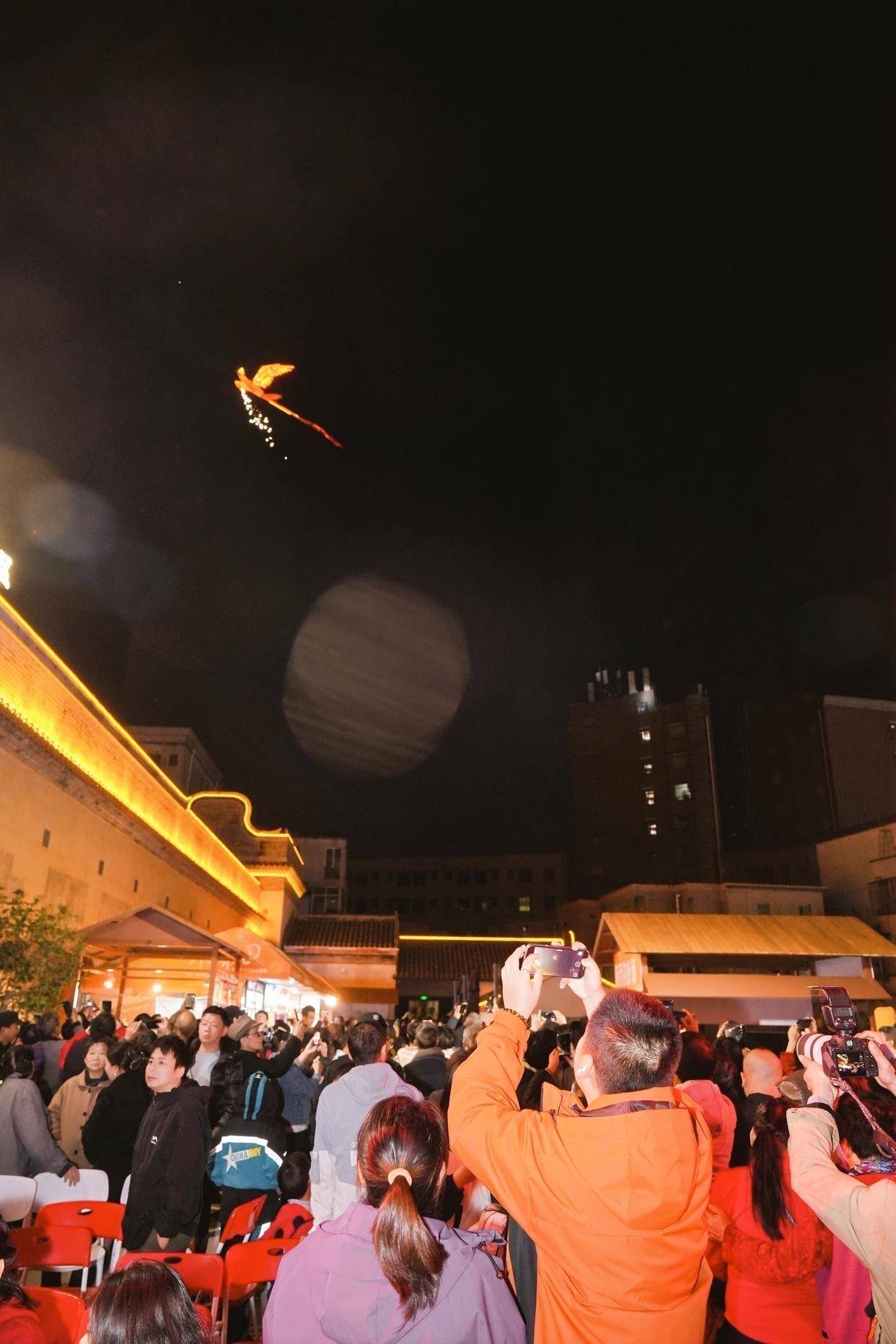 值得一提的是,每晚的《飞天凤凰》表演堪称一绝。一只巨大的“凤凰”展翼高飞,在围屋的上空盘旋翱翔,仿佛一只真正的神鸟降临人间,引得现场观众阵阵惊叹。“空中飘雪”环节中,簌簌细雪从围屋的屋檐上飘落,如梦如幻的场景瞬间营造出一种浪漫的氛围。古今交融的奇妙画面,瞬间点亮了全场,让每一位观众都沉浸其中,流连忘返。
